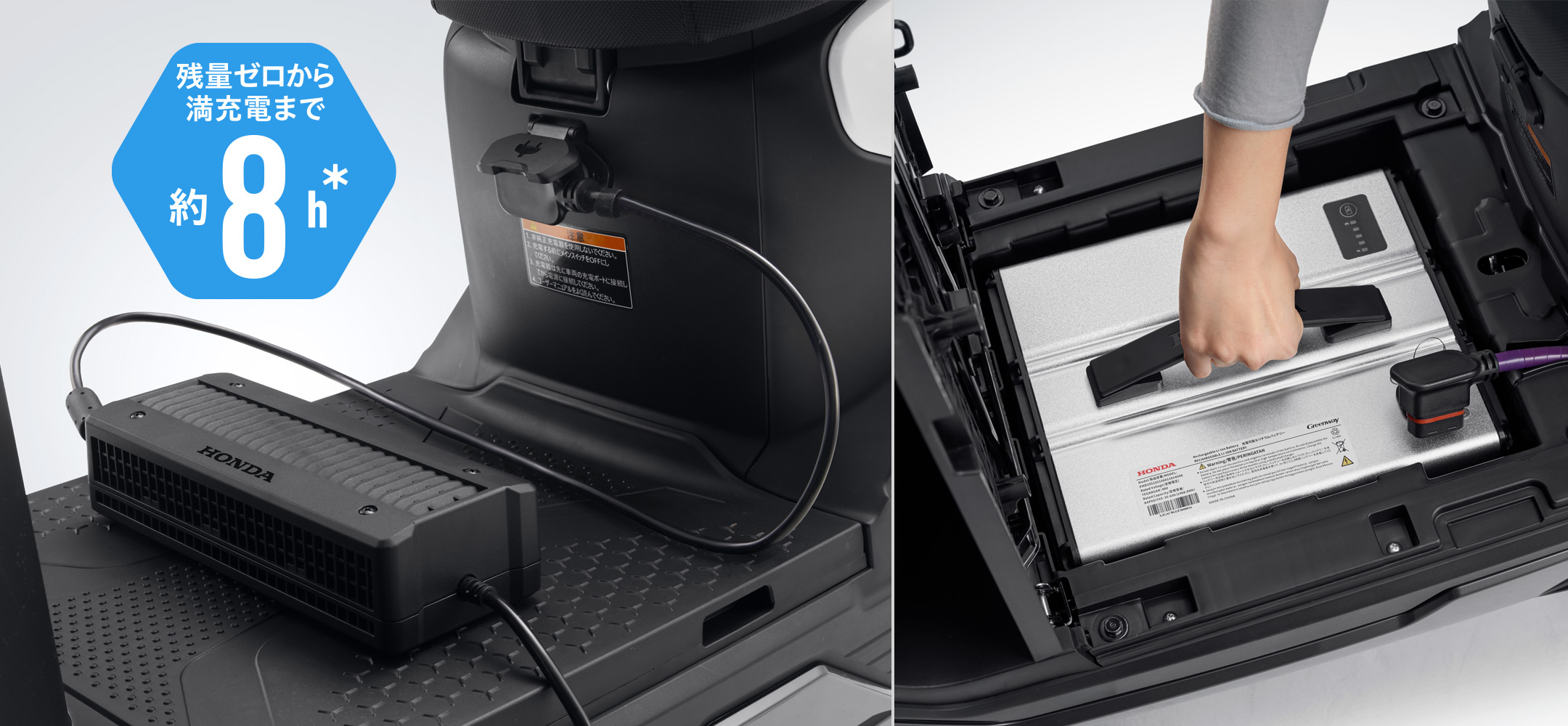 車体の充電口に差すだけでも、取り出したバッテリーにつないでも。