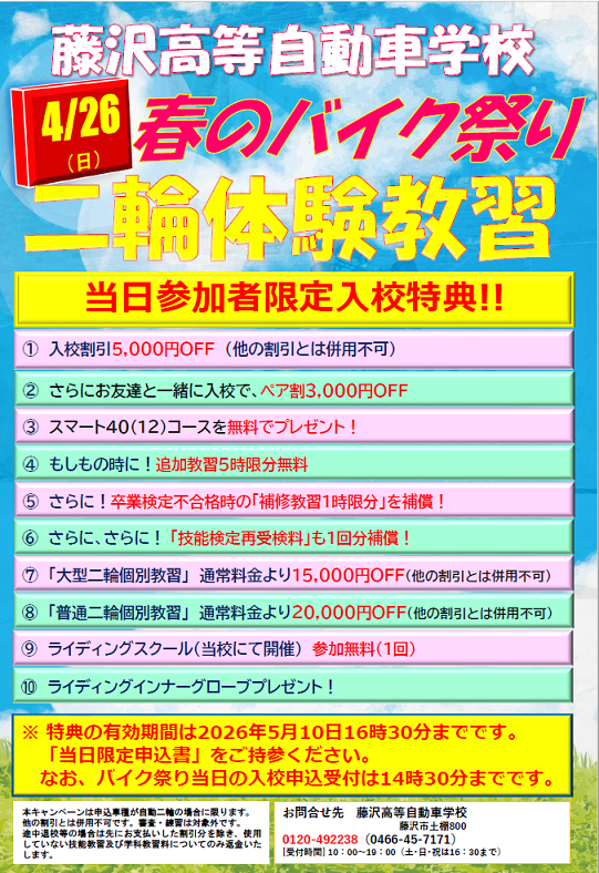 藤沢高等自動車学校にて「春のバイク祭り」を開催いたします!