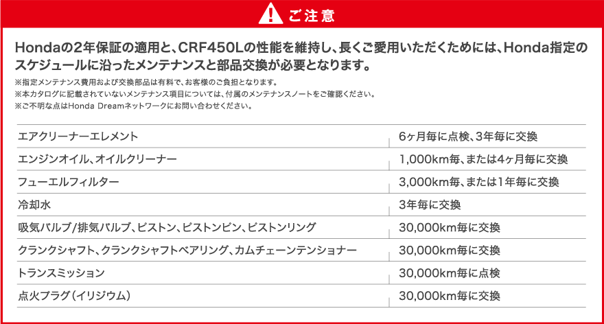 Hondaの2年保証の適用とCRF450Lの性能を維持し、長くご愛用いただくためには、