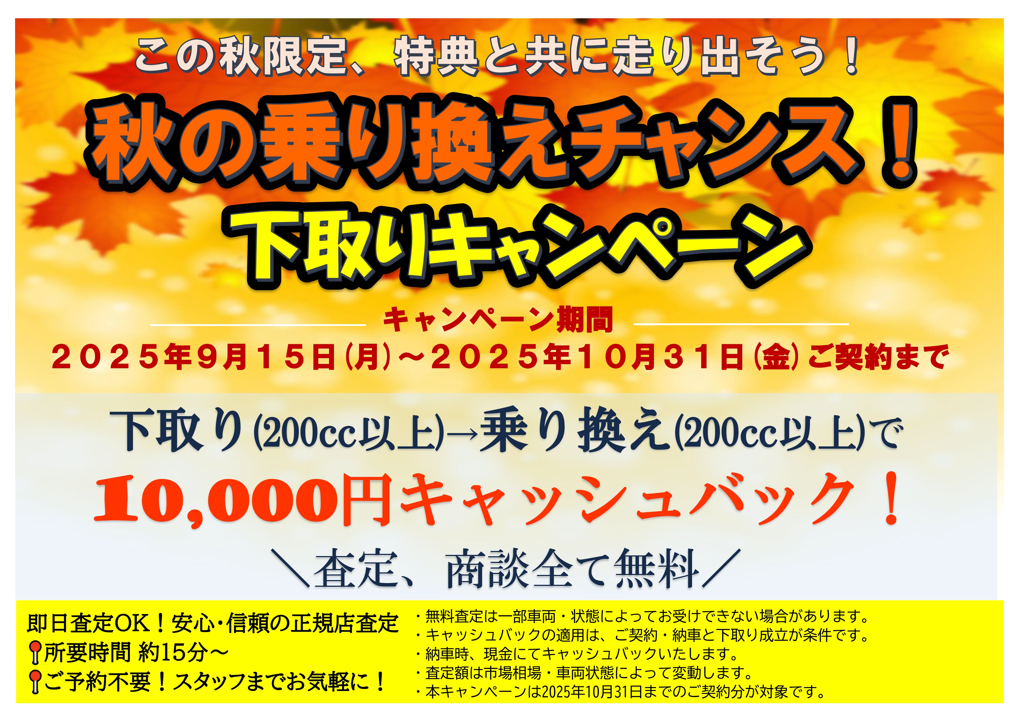下取り車両(200㏄以上)→乗り換え(200㏄以上)で10,000円キャッシュバック!