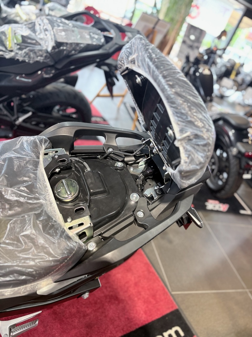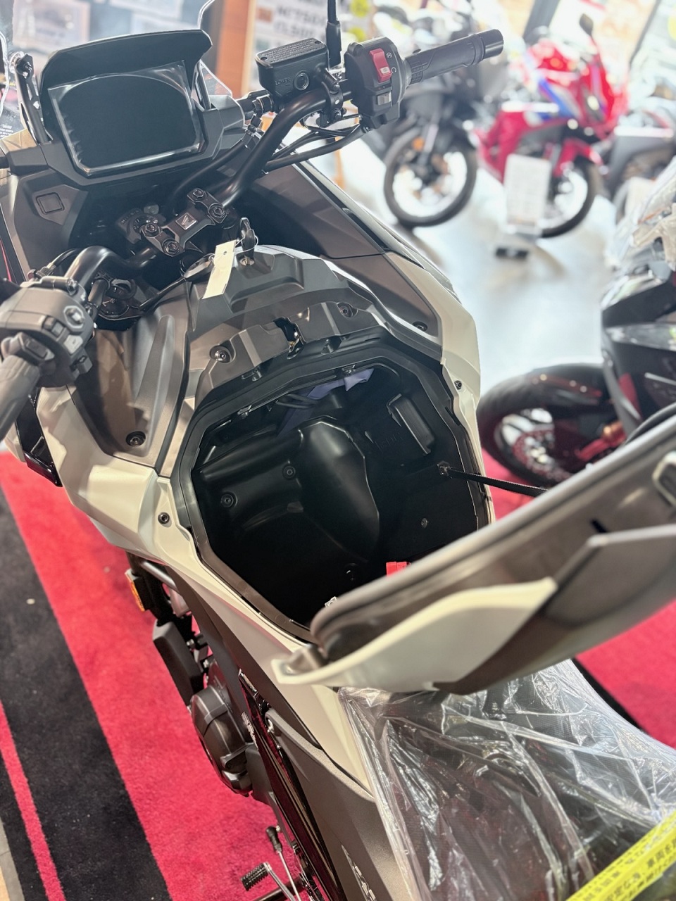 燃料タンクの位置に23Lのラゲッジボックスがあり、フルフェイスヘルメットが入ります!